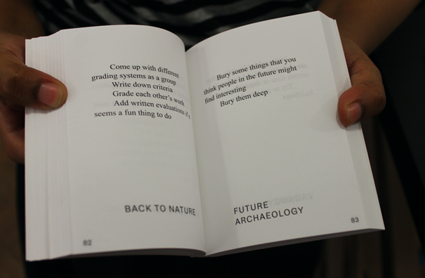 Für das Zine sendet ihr mir also zwei A4 PDF-Seiten ein. Darauf sollten euer Konzept erklärt, der Ablauf, das benötigte Material aufgelistet, das Setting beschrieben (Lichtsituation, Ort), und konkrete Handlungsanweisungen angegeben sein. Schreibt auch einen kurzen Abschnitt über die Absicht oder Hintergedanken, die ihr zu eurer Performance habt. Was wollt ihr damit aussagen? (3-4 Sätze) Die Arbeit darf reduziert sein – schreibt keine Theaterstücke. (Sowieso, es lohnt sich oft, eine Performance auf das Nötigste herunterzubrechen, um eine klare und durchschlagsstarke Arbeit zu erhalten.) Ihr könnt einen kleinen Comic machen mit Strichmännchen oder schematischen Zeichnungen, von Hand oder digital schreiben oder den Ablauf durch eine Fotoserie oder Videostills verbildlichen. Wichtig ist, dass euer Konzept klar nachvollziehbar wird und von jedem/jeder nachperformt werden könnte. Zusätzlich kann eure Doppelseite eine Fotografie, eine Zeichnung, eine Collage, ein Text oder Gedicht enthalten. Vielleicht findet ihr sogar noch andere Formen. Zur Inspiration sende ich euch noch einige Konzepte aus dem Buch: Selbst übersetzen – Ein Performance Lesebuch zum Aufführen.